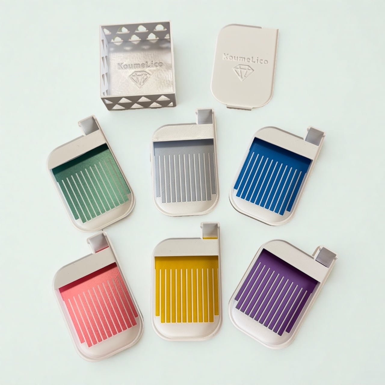 ストッパー要らずのミニミニサイズのちびトレイの6色セット+蓋1枚+専用箱のセットとなります。